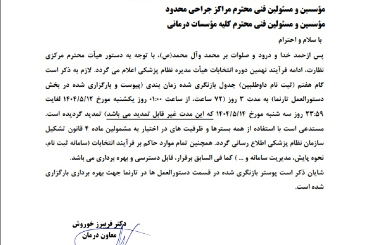 به پیوست راهنمای آموزش ثبت نام داوطبین عضویت در نهمین دوره انتخابات هیأت مدیره نظام پزشکی که در تارنمای خبری و اطلاع رسانی وزارت بهداشت به آدرس: https://9thrmses.behdasht.gov.ir