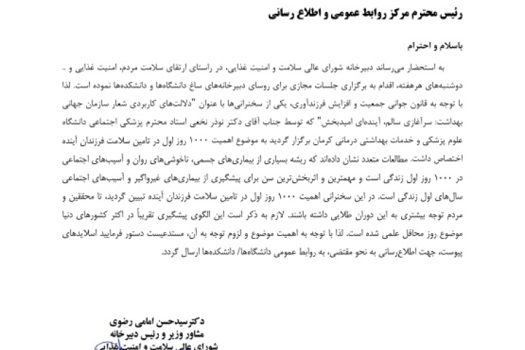 با توجه به اهمیت 1000 روز اول زندگی به عنوان " اثر بخش ترین سن برای پیشگیری از بیماری های غیر واگیر و آسیب های اجتماعی ( دوران طلایی) به لینک مربوطه مراجعه فرمایید.