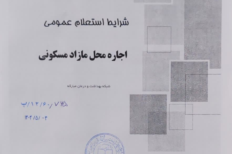شبکه بهداشت و درمان شهرستان مبارکه در نظر دارد ساختمان قدیم مرکز خدمات جامع سلامت دیزیچه (واقع در شهر دیزیچه روبروی ریل قطار) را به صورت اجاره بهای ماهیانه و از طریق مزایده به متقاضیان حقیقی یا حقوقی واجد شرایط جهت مسکونی، آموزشگاه و نمایشگاه واگذار نماید. متقاضیان تا تاریخ سه شنبه مورخ 14 مردادماه 1404جهت دریافت فایل استعلام، پاکت شرایط و اطلاعات بیشتر به واحد دبیرخانه این شبکه مراجعه نمایند.