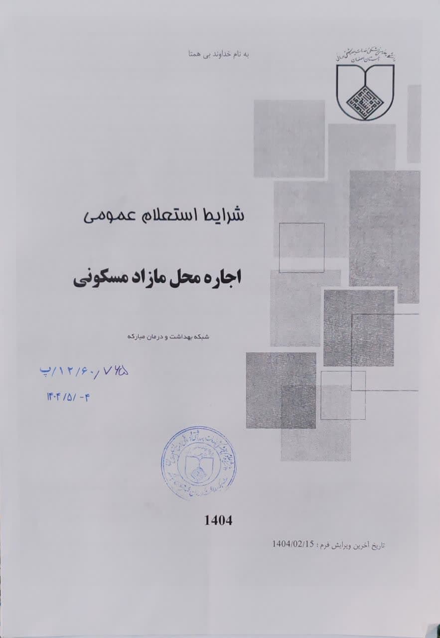 شبکه بهداشت و درمان شهرستان مبارکه در نظر دارد ساختمان قدیم مرکز خدمات جامع سلامت دیزیچه (واقع در شهر دیزیچه روبروی ریل قطار) را به صورت اجاره بهای ماهیانه و از طریق مزایده به متقاضیان حقیقی یا حقوقی واجد شرایط جهت مسکونی، آموزشگاه و نمایشگاه واگذار نماید.
