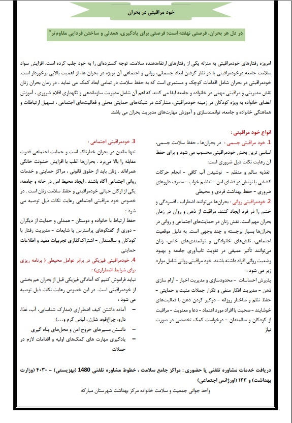 امروزه رفتارهای خودمراقبتی به منزله یکی از رفتارهای ارتقاءدهنده سلامت، توجه گستردهای را به خود جلب کرده است. افزایش سواد سلامت جامعه درخودمراقبتی با در نظر گرفتن ابعاد جسمانی، روانی و اجتماعی آن بویژه در بحران ها، از اهمیت بالایی برخوردار است. خودمراقبتی در بحران شامل اقدامات کوچک و مستمری است که به حفظ سلامت در تمامی ابعاد کمک می نماید . در زمان بحران زنان نقش مدیریتی و مراقبتی مهمی در خانواده و جامعه ایفا می کنند که اهم آن شامل مدیریت سازماندهی و نگهداری اقلام ضروری ، آموزش اعضای خانواده به ویژه کودکان در زمینه خودمراقبتی، مشارکت در شبکههای حمایتی محلی و فعالیتهای اجتماعی ، تسهیل ارتباطات و هماهنگی خانواده و جامعه، توانمندسازی و آموزش مهارتهای مدیریت بحران می باشد.